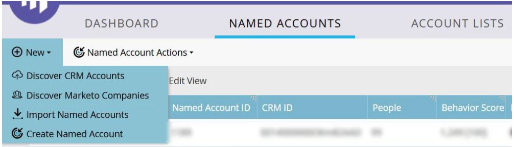 4. Build out your Named Accounts in the Account Based Marketing Module. The companies in your Target Account List may already exist in your CRM, but some may not. To add them to the ABM module, look for them first in the Discover CRM Accounts section. If you don’t find them there, search for them in the Discover Marketo Companies section, and add them.