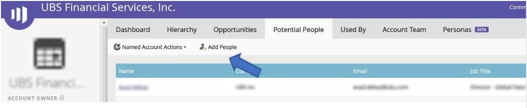 - Under the Named Account tab, click on the specific named account and navigate to the Potential People tab. This is where you find weak matches associated with the account. After analyzing the potential people, click the person or people you would like to add to the named account and click Add People.