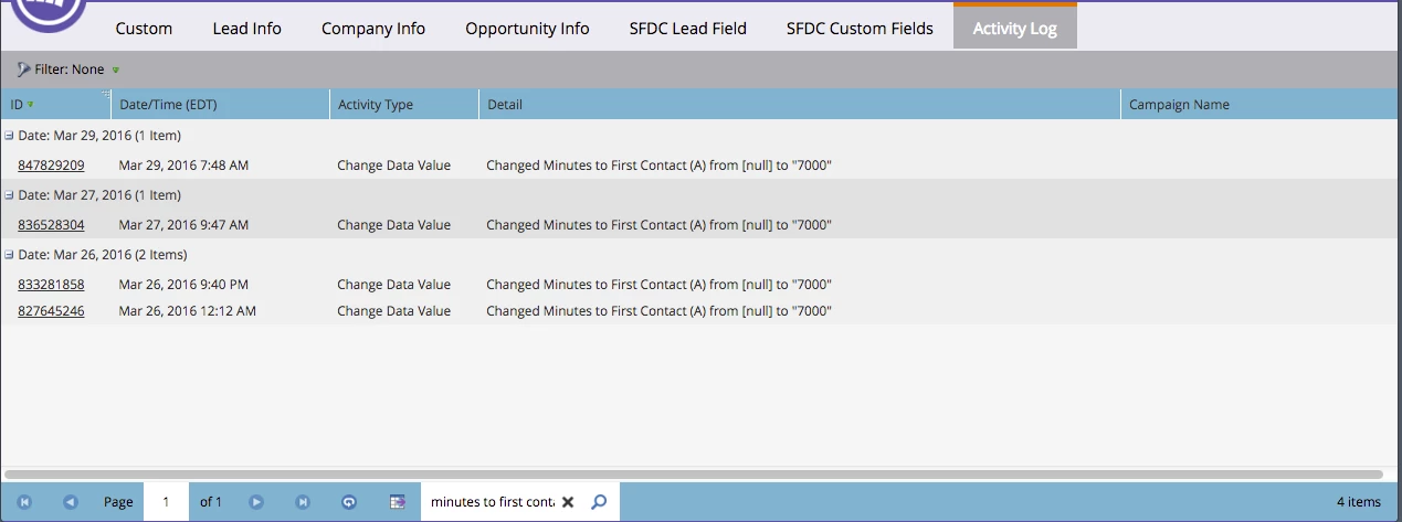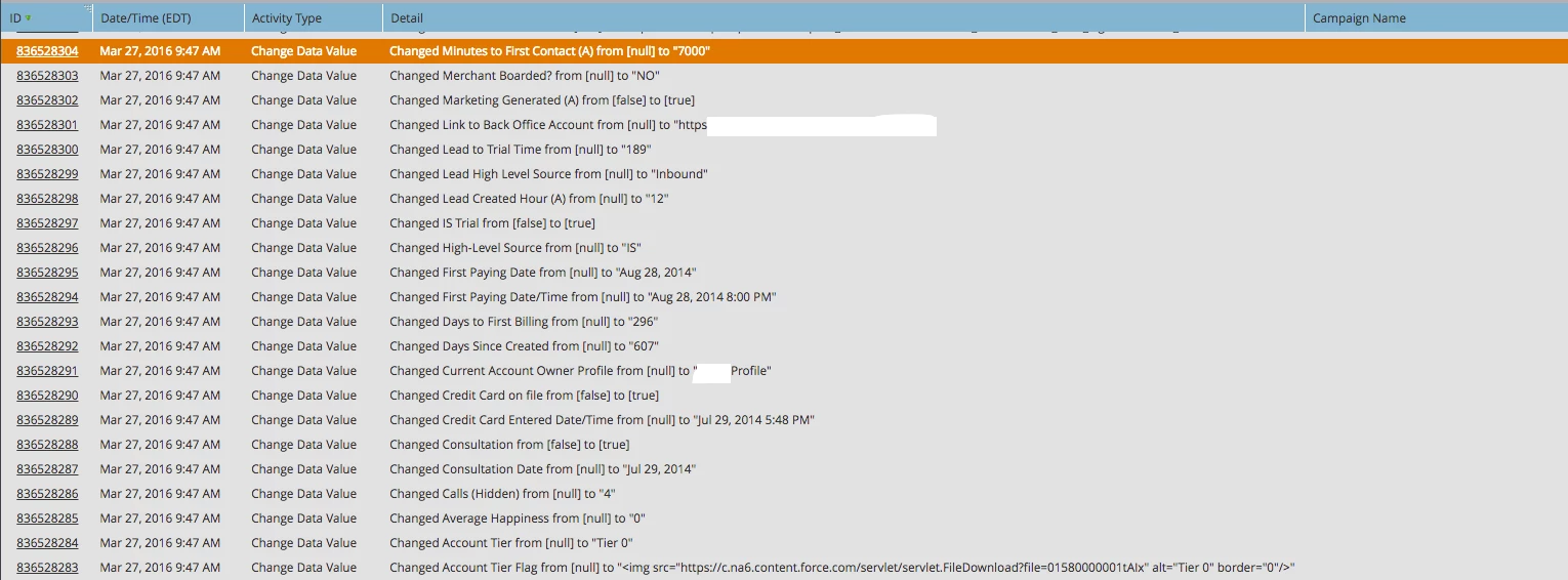 For example, the screenshots below are from one contact and you can see that the same fields are being changed over and over again from null to the value on their SFDC record. There is no activity of the field being set back to null, only the field being set to the SFDC value. I've highlighted one specific field where the value keeps changing from null to 7000, but you can see there are a number of fields showing this behavior.
