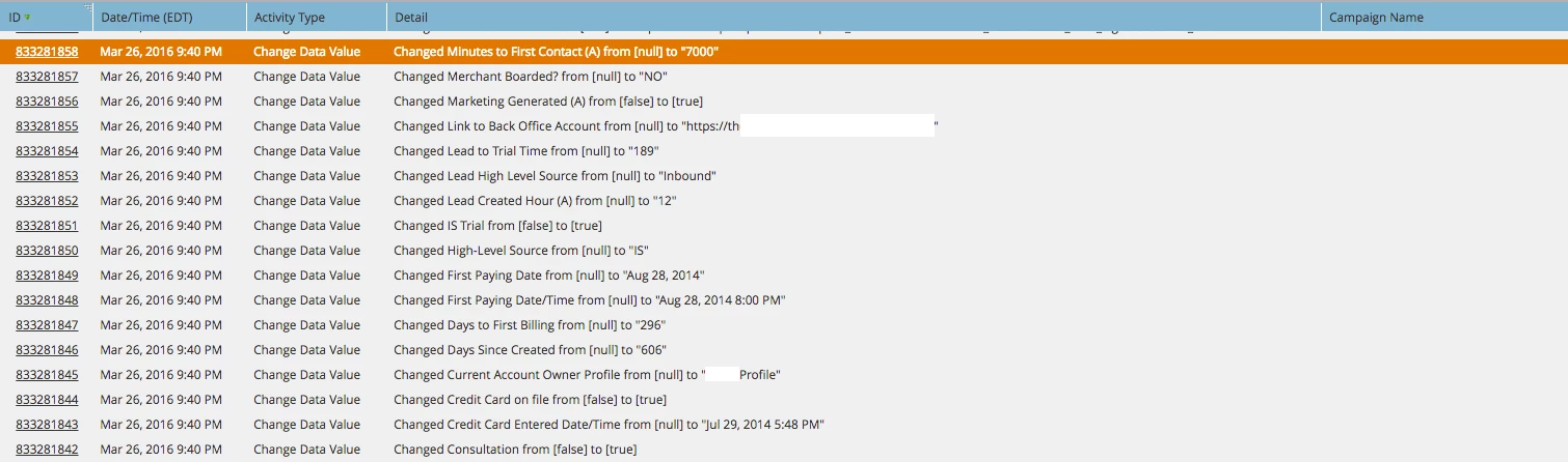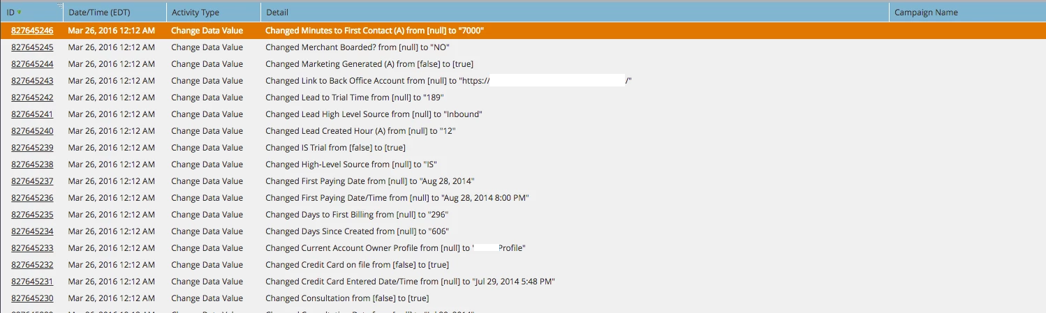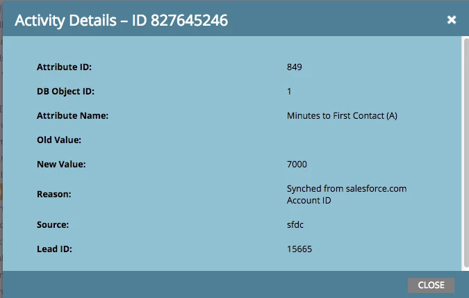 Since these are fields on the account object, we thought these changes were made in Salesforce and then synced to the Marketo record. When you open up the activity detail, the reason says synced from Salesforce account. However, we checked with our Salesforce Admin and confirmed these fields were not changed in Salesforce per their activity logs (changed values are documented in the system information section). Furthermore, some of the affected fields (like Minutes to First Contact and First Paying Date) are fields that cannot be edited by any of our Salesforce users, including our Admin. Once these fields are populated, their values do not get updated.