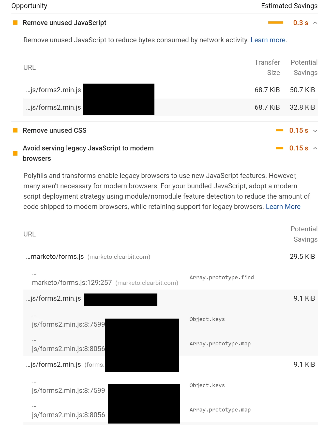 The last image are the performance flags that google page speed throws for the Marketo script.