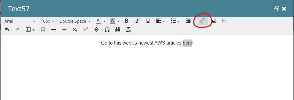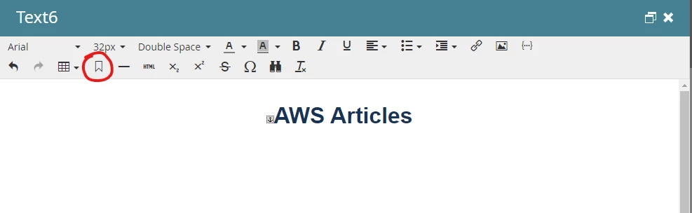 First, you use the "Insert Anchor" option when editing the rich text the link will be going to. Name the anchor something appropriate, especially if you're going to have multiple anchors within the email. In this example, I used "ToC_to_AWS_Articles".