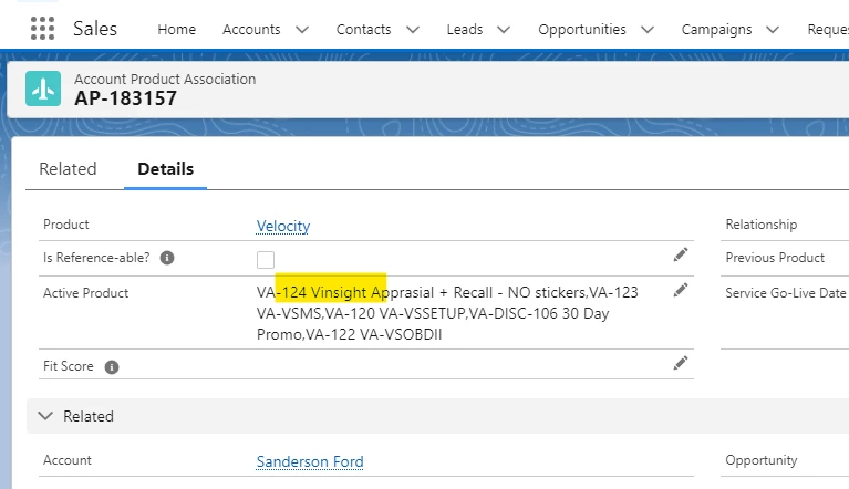 I am looking to pull data from Salesforce for a product association. You can see the field in the screenshot here under the field Active Product. I do not see this field in Marketo. How can I pull this field into Marketo?