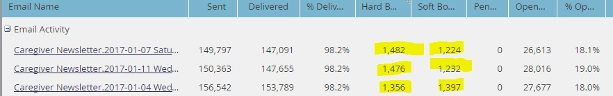 The purpose of my questions was an attempt to explain why 2000 emails were bouncing each send as it was a clean list upon initial import. However, if we are not removing the bounced emails from the next send, could it possibly be the same 1000 emails emails bouncing?