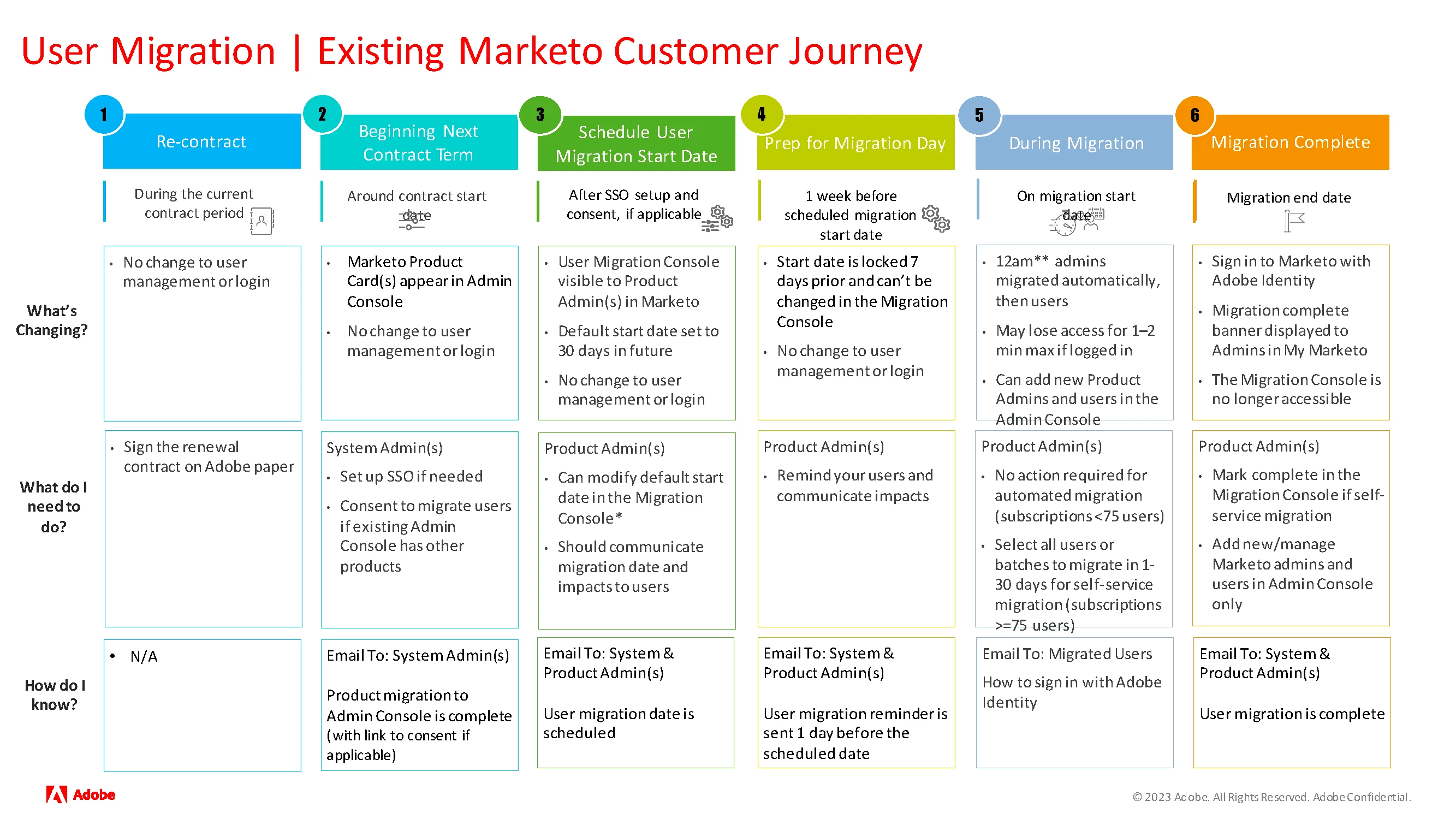 Existing Marketo Engage subscriptions are currently being migrated to the Adobe IMS upon any sales event, which includes renewals, re-contracting events, and/or addendums. Migrations outside of a sales event are now supported as of October 2024.