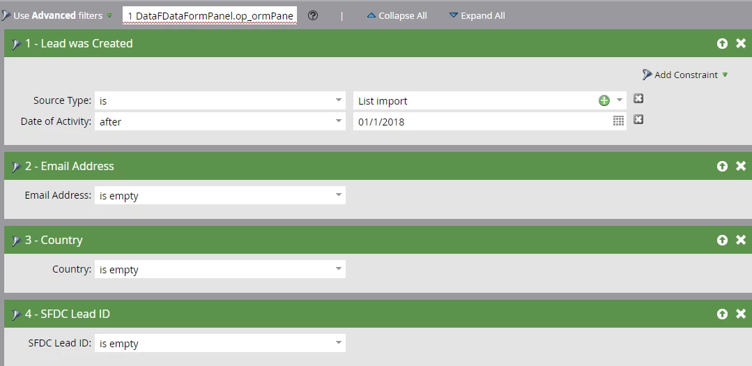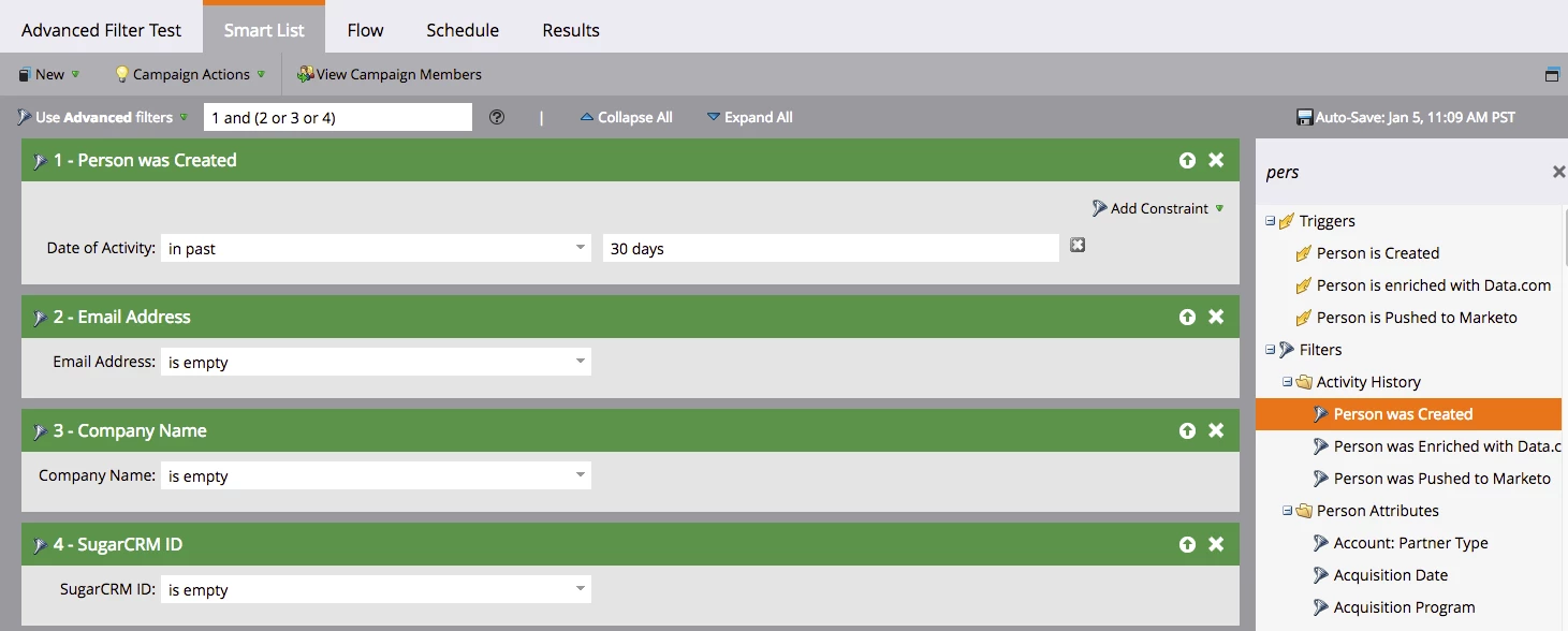I created a smart list and have the logic as below, by using Advanced filters 1 and (2 or 3 or 4). However, after I go back to my smart list, it shows me "not saved, invalid expression". I tried 1 and (2 or (3 or 4)), but Marketo still throw out the error. Can anyone kindly share with me why I got this error and how should I modify the advanced filter to make it run properly?
