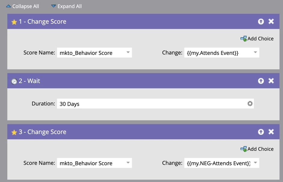 For each smart campaign, the flow is (1) Change Score > Recent Behavior Score = {{my.Attends Event}}; (2) Wait 30 Days; (3) Change Score > Recent Behavior Score = {{my.NEG-Attends Event}}