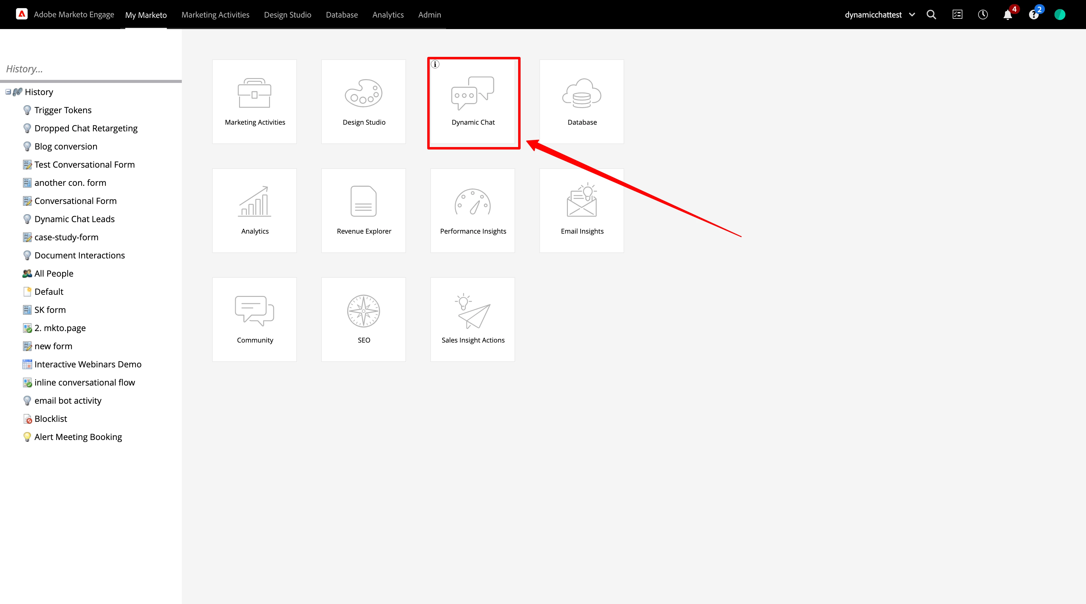 - Login to your Marketo instances > My Marketo > click on Dynamic Chat tile