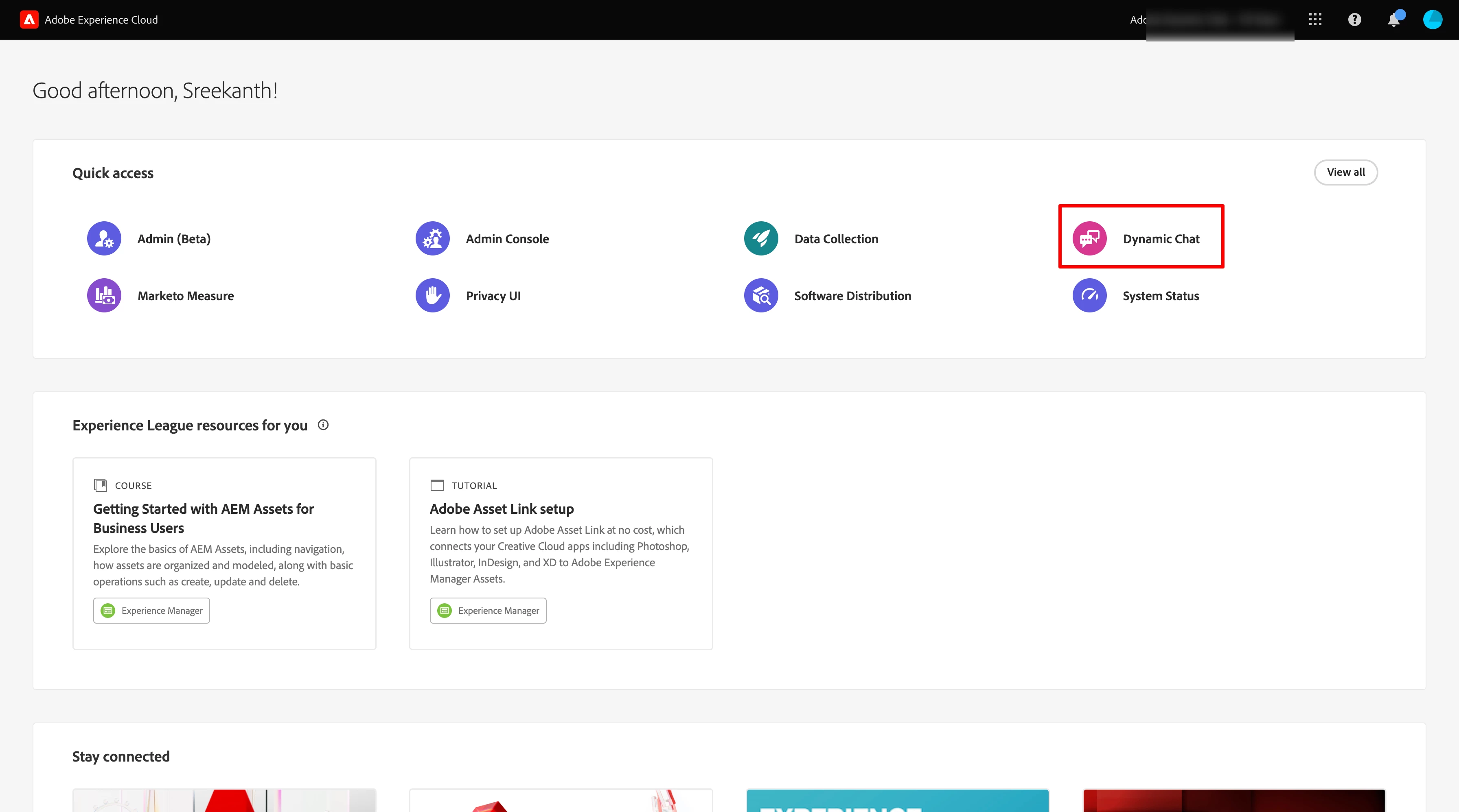- Once you have done with the login, you will be redirected to your Dynamic Chat instance or https://experience.adobe.com