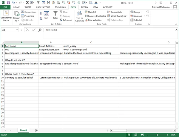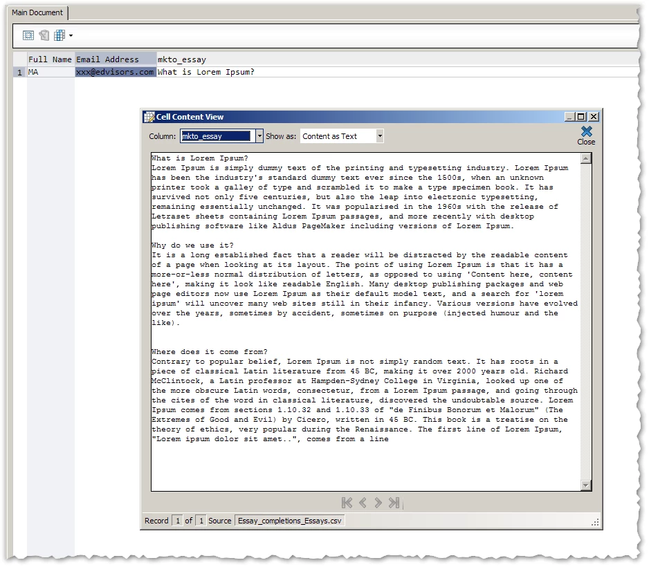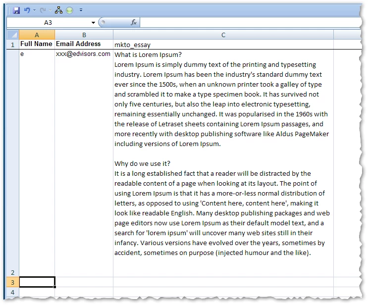 The form works, the problem is downloading the list of people with their essays. This list is created by a smart list. When downloading the list we are limited to a tab delimited or a csv. When I open it the essays will not be contained in their cell because either a carriage return is recognized as a tab or a comma in the essay moves the copy into a cell.