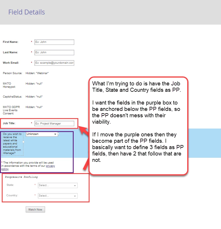 2. If you place it at the bottom of the form, it's included in the progressive profile fields and only shows up at the end. Again, not ideal.