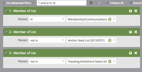 I'm setting up a smart list that is trying to pull anyone who is in list A but "not in" smart list list B or C, and I'm applying "or" filters between B & C. In my logic I would say 1 and (2 or 3). However, when I run it, it's not excluding the leads properly -- I'm getting tied up in the "not in"/negative logic. Has anyone else encountered this scenario? Is "and" the right way to go instead of or -- why? I would think it needs to be "or" because I'm trying to pull anyone who matches any of these "not in" criteria, not matching all of the criteria.