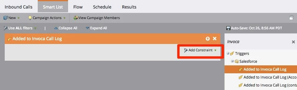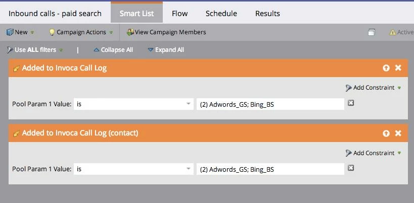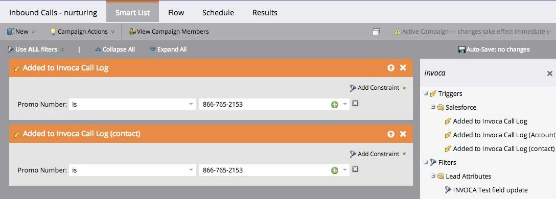 These triggers and filters behave like all other Marketo triggers, and you can use Marketo's Add Constraint to filter on any call data point that Invoca captures.