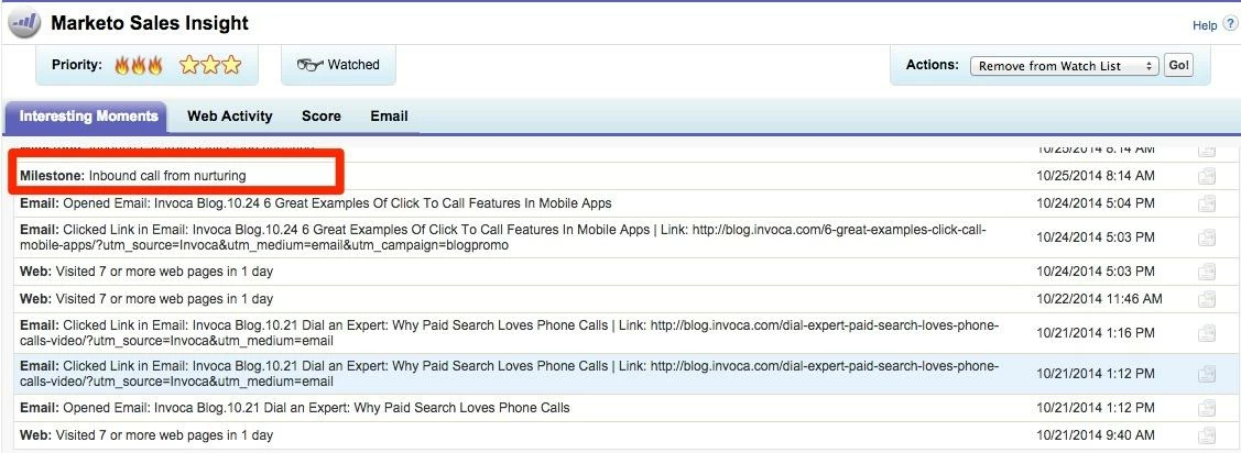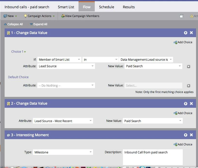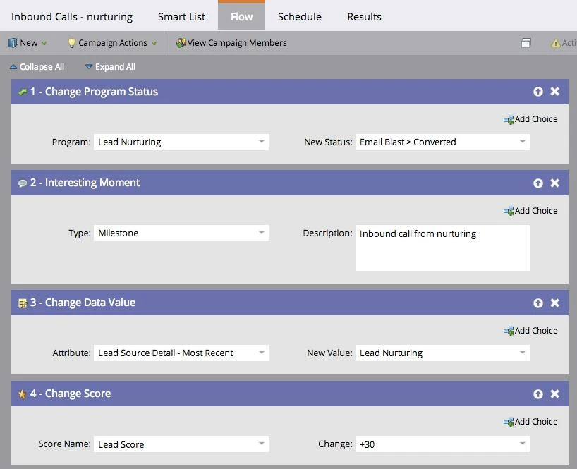 When the condition is met, we change our lead nurture program status to converted (success), create an interesting moment in Salesforce so that call is now a visible part of the rep’s view of the prospect's engagement, change lead score, etc. Flow step 1 is important because without it, our Marketo nurturing program and corresponding SFDC campaign would not get proper attribution/ROI credit.