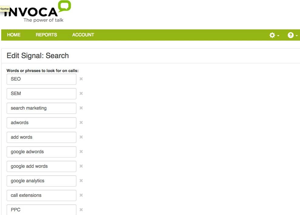 At Invoca, we sell to many different types of marketers, with search marketers being one of our main targets. So we setup a "Search" Signal, where if any of these words are mentioned on the call, it's likely a search marketer, and marketing now knows to send them search-related content.