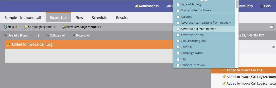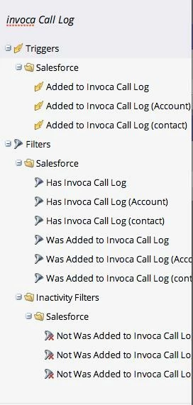 Once you've enabled the custom object sync, you'll get this new set of Invoca Call Log triggers and filters to work with in smart campaigns and smart lists.