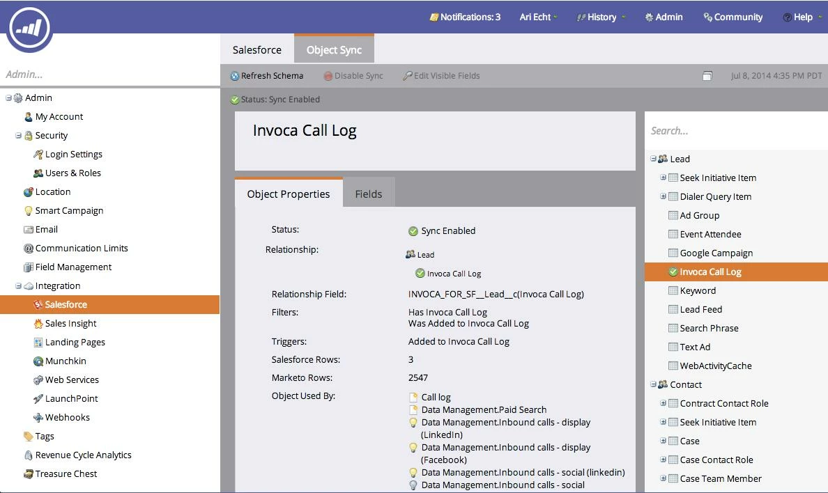 The nuts and bolts first. In Marketo Admin, you'll enable the Salesforce Object Sync with the Invoca Call Log, which is a Salesforce Custom Object.