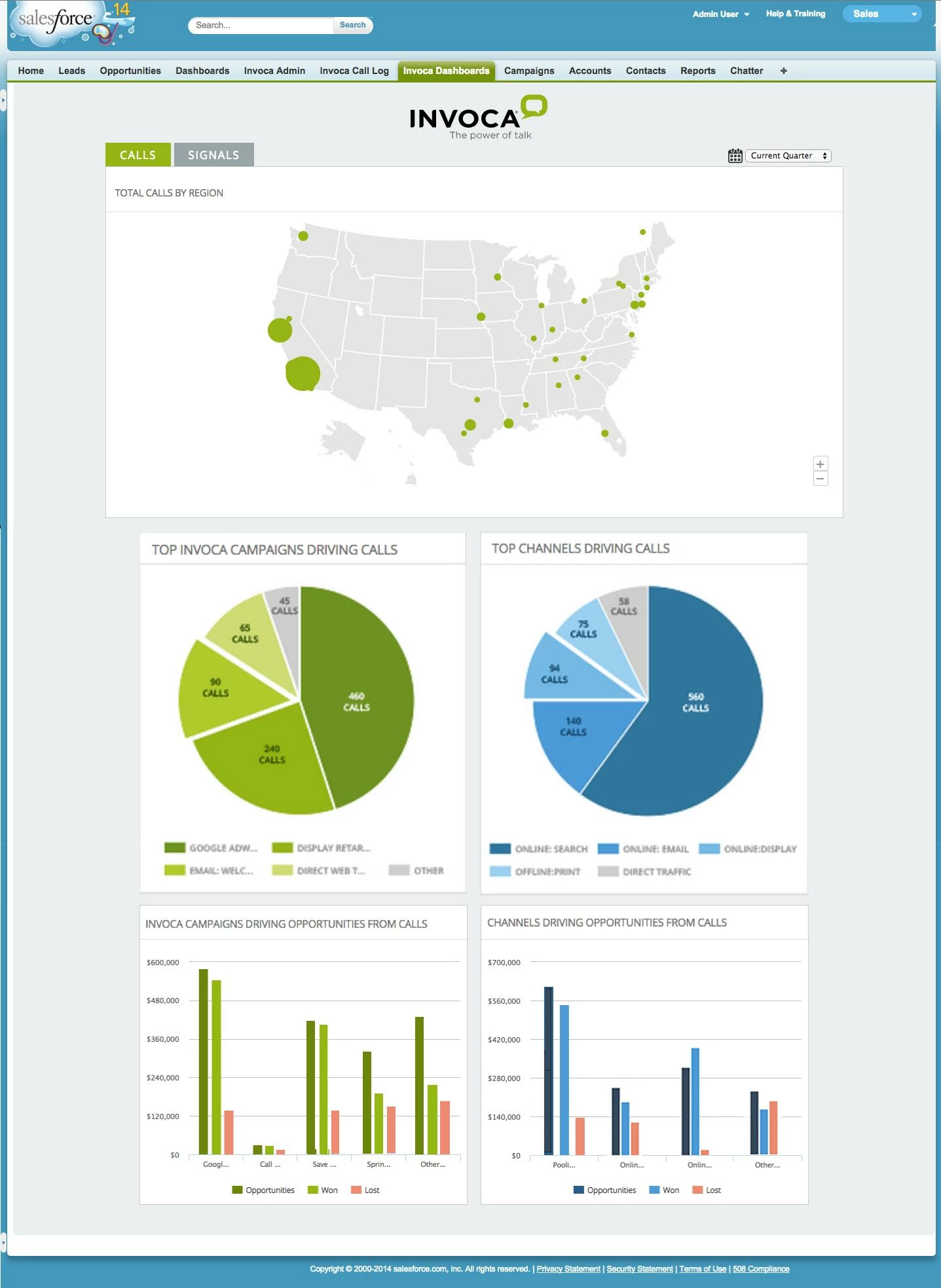 On the Salesforce side, pre-canned Invoca dashboards provide an aggregate view of all your call data so you see which marketing channels and campaigns are driving calls, and which ones are turning into revenue.
