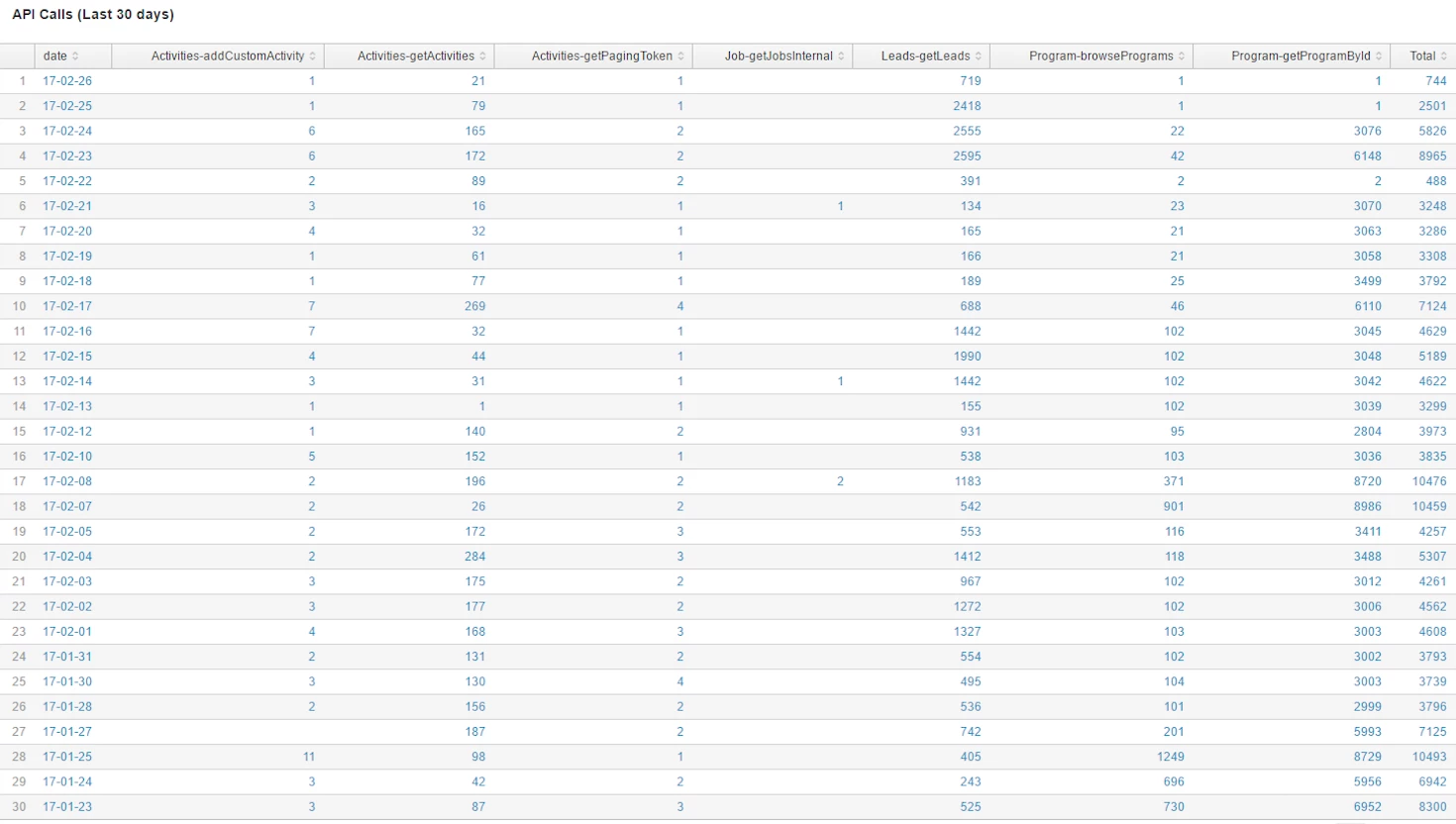 Normally, if I'm looking to gauge the amount of API calls made to Marketo, I'd monitor the core systems that are calling to Marketo--it's accurate and easier than periodically checking. However, if you're in a situation where you're trying to do an analysis of what's even calling the API, is there a way to query the amount of calls that Marketo has recorded? I'd like to record how many calls are being made over a certain time span.