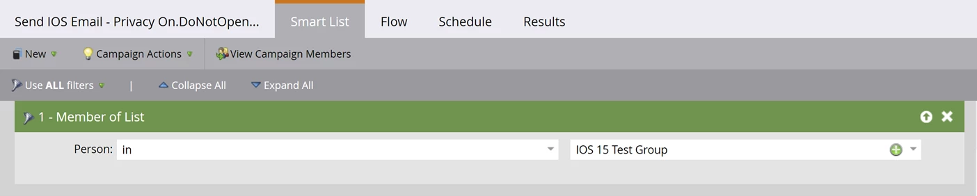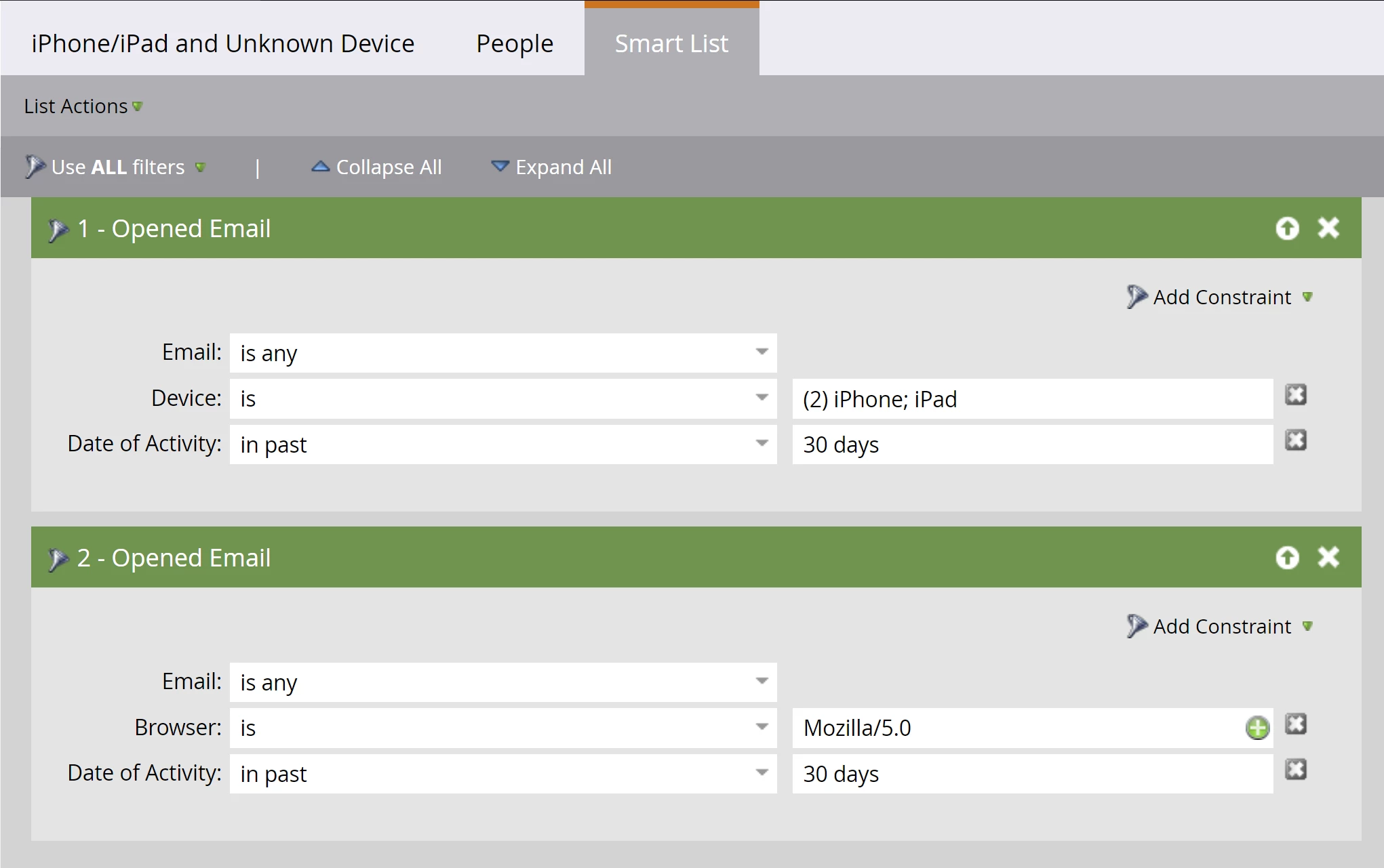 First, build a smart list that looks for leads that have opened email using an earlier version of iOS. Since at the time of writing, iOS15 is only available on iPhone/iPad, we limit results to those devices only.