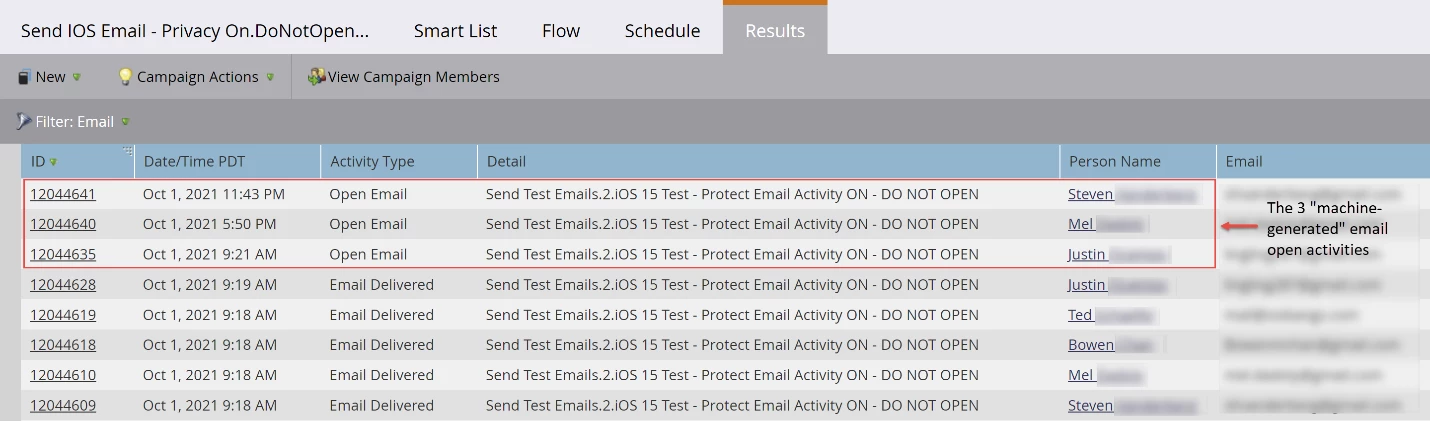 We then had testers go ahead and open the delivered emails. For the 2 emails that did not machine-generate an open, we found 2 email open activities were logged as usual. For 3 emails that did machine-generate opens, no additional open activities were observed as expected. This is because Marketo only ever records a single email open activity for any given campaign/mailing/lead combination.