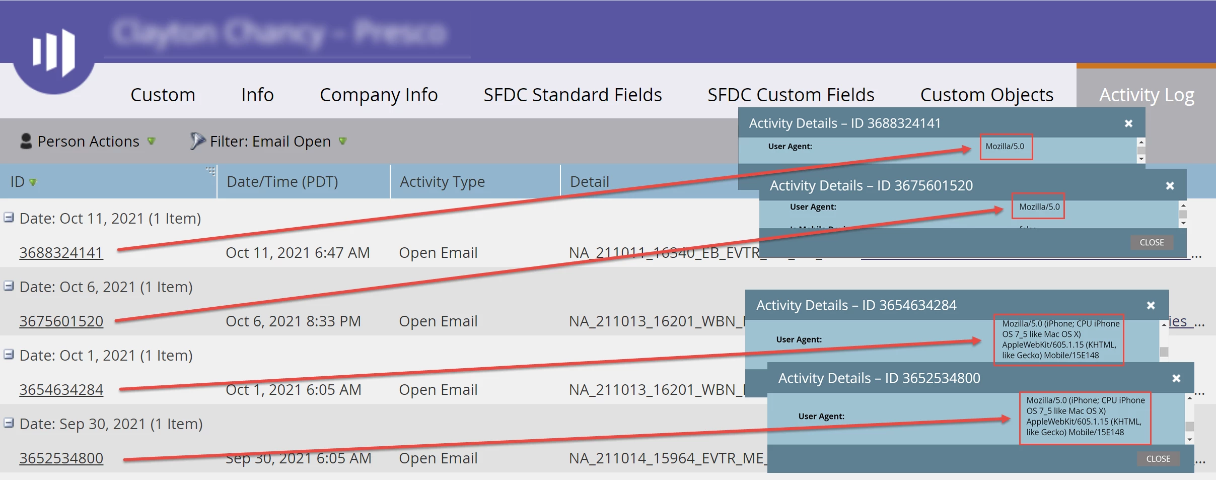 From this list, you can inspect the lead activity history and identify when a lead switched over to iOS15.
