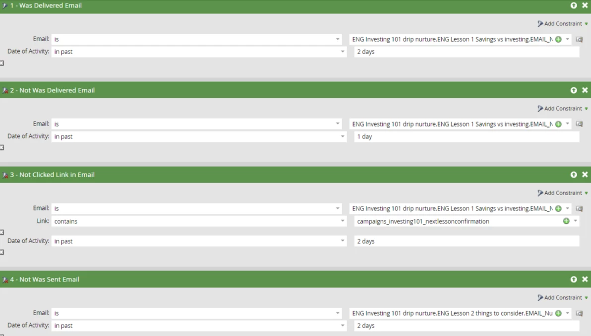We will be running a drip campaign with 11 emails and we want to set the cadence to send it out to everyone every 2 days unless they click on a specific link in the email which says they would like to receive it immediately instead. I am struggling with the logic of path 2 and hoping someone might be able to assist with sense checking the below.