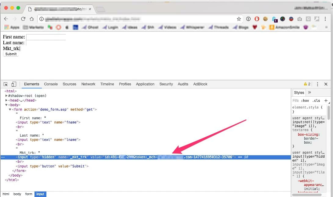 Armed with this knowledge, we can look at the solution here. the process is straightforward and we're helped by Munchkin. When you create a form field called "_mkt_trk" within a non marketo form on a page where Munchkin code is running, Munchkin knows enough to populate the value of that form with the Munchkin Cooke value.