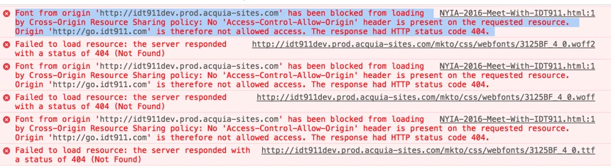 I'm trying to use a webfont in our templates, but it's not applying. The font's sitting on our dev servers. The file paths all seem good. My reference to the style sheet for these fonts is in the header. I've also tried it outside of the header. I've tried the font reference hardcoded into the template. Nothing seems to work. On a Chrome browser, on my mac, it worked. So I had somebody else try it on theirs, and nope. I've cleared cache everywhere a dozen times over. So now... I'm stumped. Maybe somebody else's eyes can see what I'm not seeing.