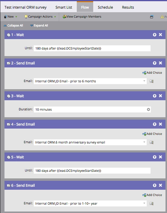 Goal of my email campaign is to email internal employees a survey at the following anniversaries: