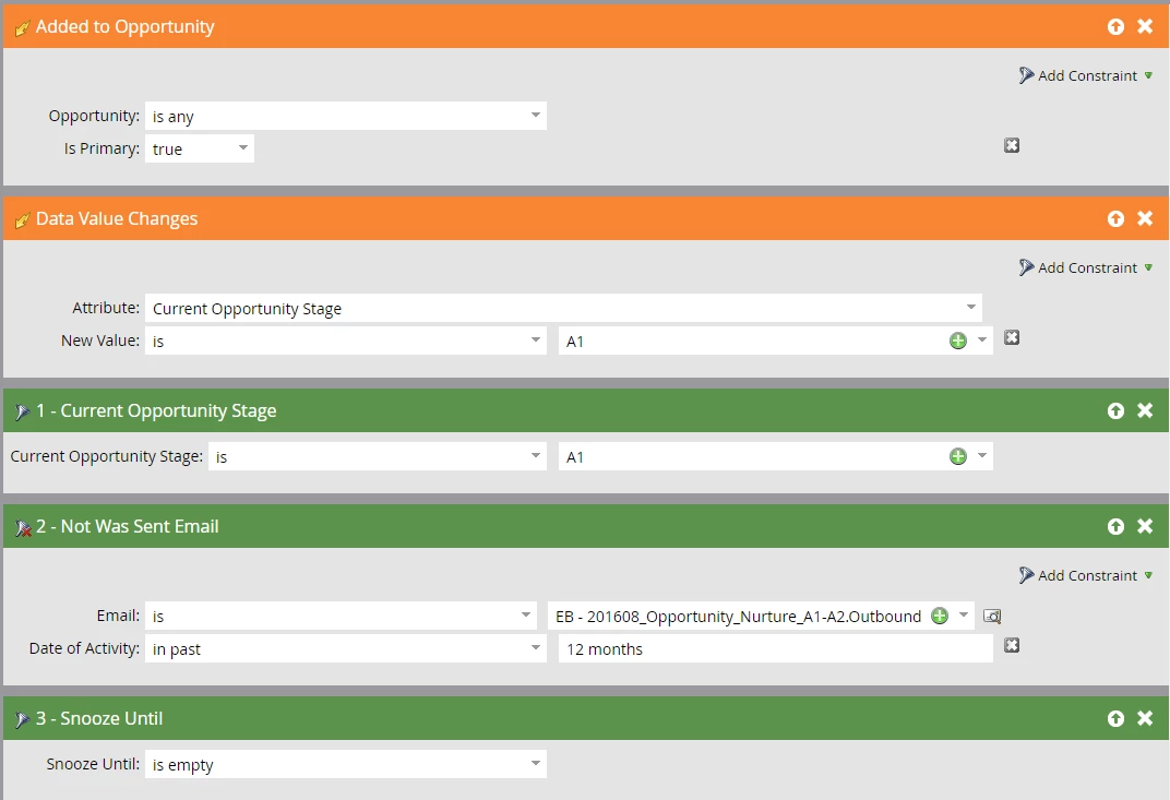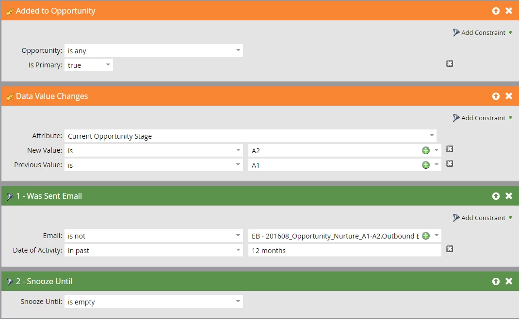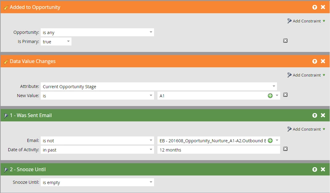 Then after that, when the opportunity moves from "A1" to "A2" another email would be triggered. Below is a screen shot of our logic so far: