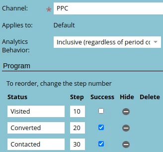The first step when creating a UTM program is to create a “Default” program type and set the “Channel” to your paid advertising or attribution channel. In this example the “PPC” channel is being used which has the “Visited” status to track anyone who visits our website from an ad campaign and the “Converted” or “Contacted” status to track anyone who signs up or contacts sales straight from the ad campaign.