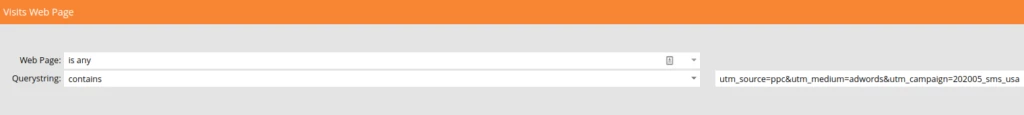 UTM tracking is achieved by using the “Visits Web Page” trigger along with the “Querystring” constraint to ensure that only web page visits with the desired UTM parameters matching our ad campaign are tracked.