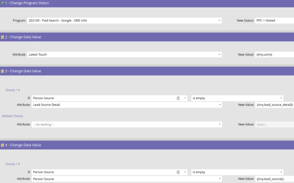 Then we will set this person’s status in the UTM program to either Converted or Contacted depending on which of the above smart campaigns they passed through.
