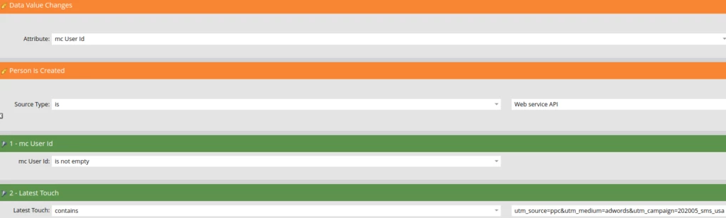 Latest Touchfield to the UTM querystring using the{{my.utm}}token. ThisLatest Touchfield will be used in the conversion campaigns below to see if this ad campaign was the last thing the person interacted with before signing up or contacting sales. - If the person’s