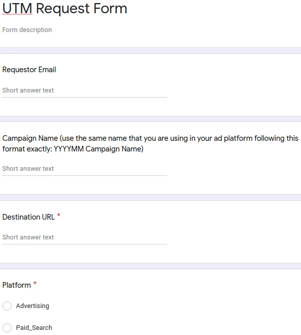 The first step in the whole process is to create a Google Form that will allow a marketing team member to fill out their ad campaign details so that we can automatically create the necessary UTM parameters later on in the UTM Builder sheet. The important thing here is to not require any text entry and only allow the marketer to select from existing options so that you will always know the options available in your form and can thus configure your UTM Builder Google Sheet to create the corresponding UTM parameters for these inputs.