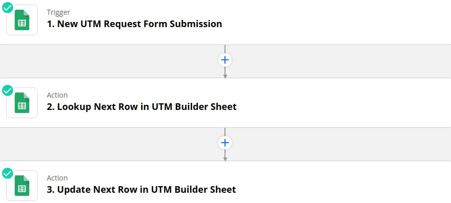 Every new submission to the UTM Request Form gets logged in the UTM Request Form Responses sheet, which in turn triggers the Zap to run in Zapier.