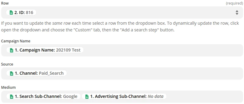 Once the Zap has been triggered, the next step is to take the row ID of this latest submission and use that to search for the row currently filled with “Next Row #” in the UTM Builder sheet.