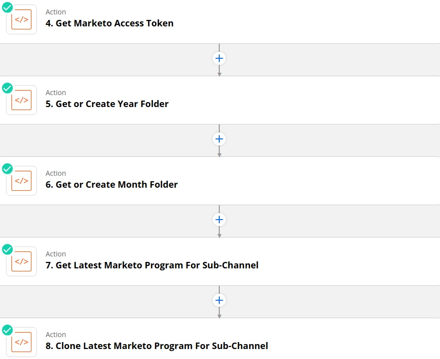 If Step 8 to clone the latest UTM program for a particular sub-channel is successful then the program ID of the newly created program will be returned. However, I often found that although Marketo was able to successfully create the new program it did not return the successful response and program ID to Zapier within the 10-sec timeout limit imposed on every Zapier action. Therefore, Step 8 would fail along with all the subsequent steps in the zap, which depend on the returned program ID.