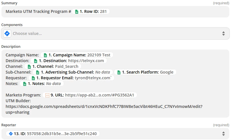 Since the Jira ticket contains a link to the UTM program that was created by the Zap, it is very easy for marketing operations to open up this ticket and go straight to the program.