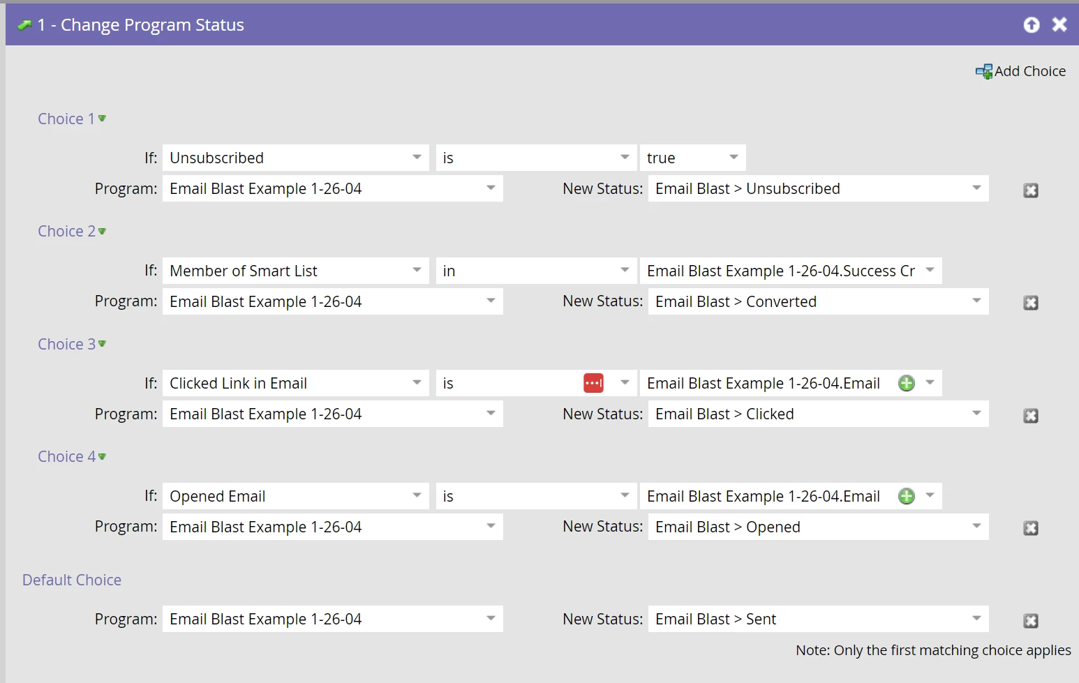 Choice 3 (third priority): If the recipient clicked a link in the email, but didn’t unsubscribe for engage in the success activity, we’d treat them as a “Clicked” status.