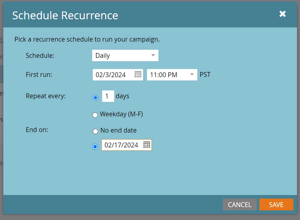 Second, by choosing the recurring batch method, you can select in Marketo when this tracking campaign is no longer relevant, and thus keep you out of the “I have two many active triggers and I have a mess on my hands” ditch (fortunately, the Marketo API has some efficient ways for getting you out of this ditch if you find yourself here, but it’s best to avoid falling into the ditch altogether).