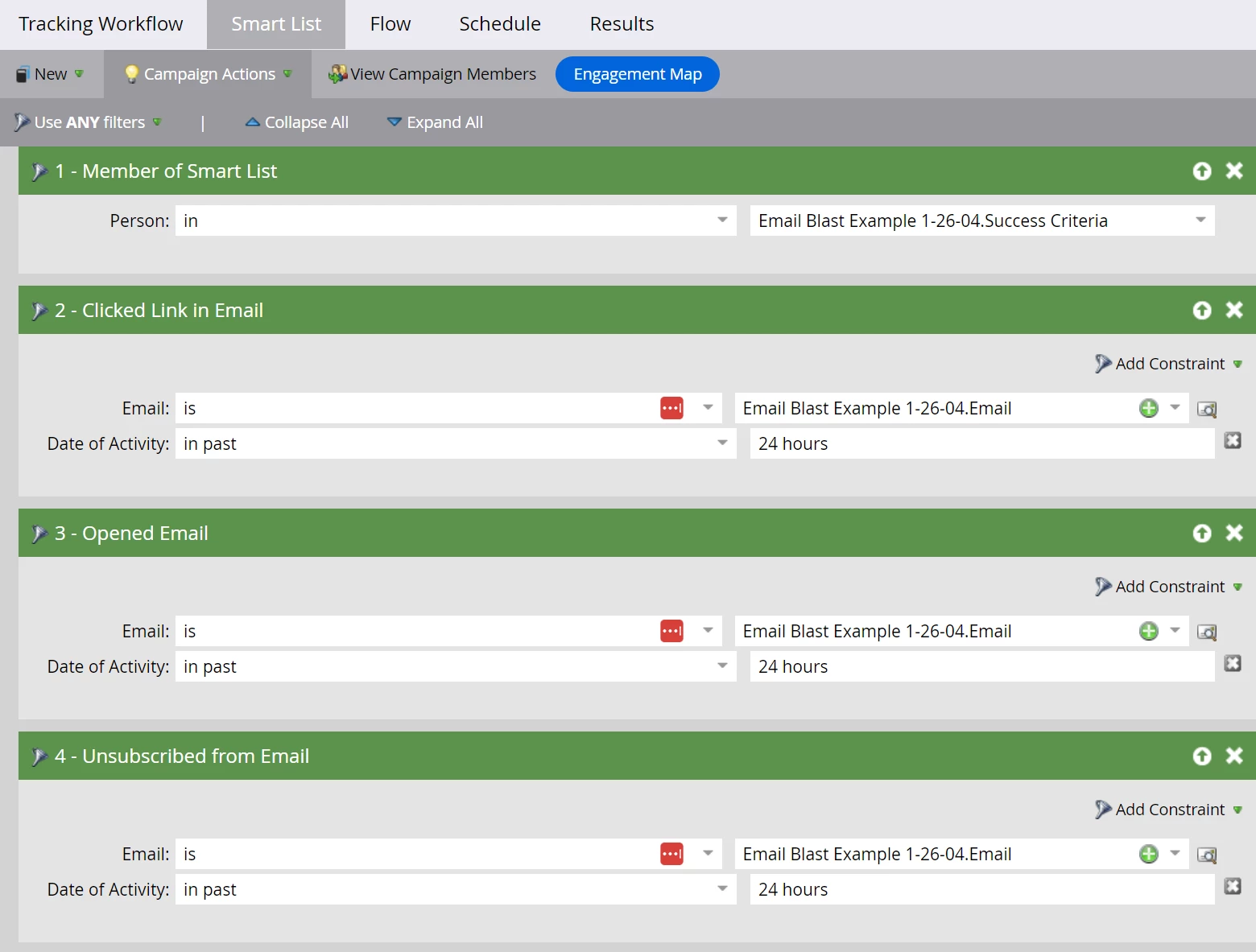 The “Any” filter criteria will ensure that any of the criteria you need to check for is accounted for in the nightly batch processing, and the 24-hour Date of Activity will ensure that each nightly trigger is reviewing activity that has occurred in a specific 24-hour period. I typically run the first batch the night after the email is sent, and will run batches for a two-week period.