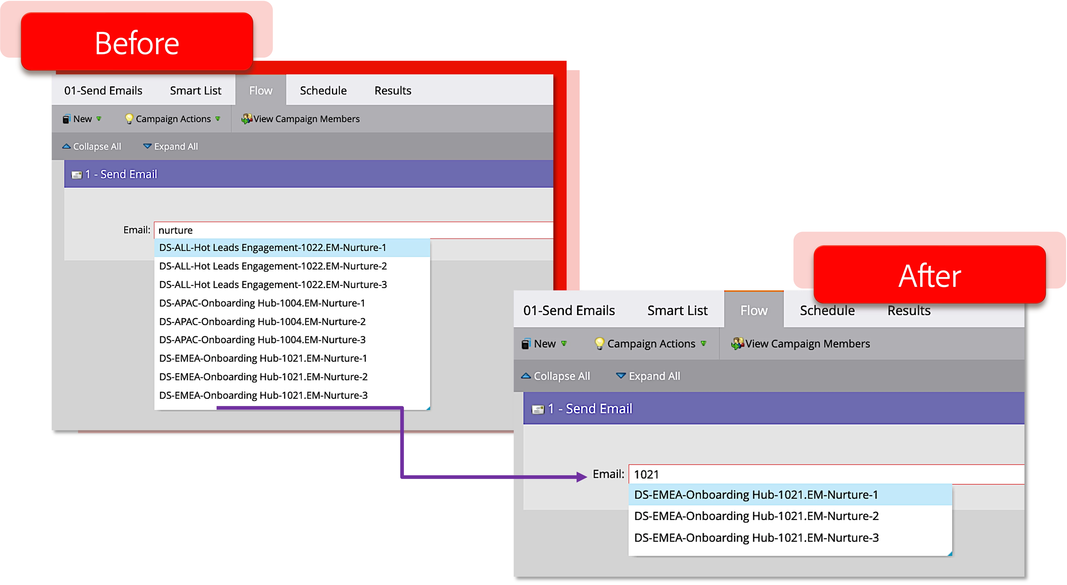 For example, let's say you are creating a smart campaign that sends out an email that is part of a nurture. You want to make sure you reference the correct email, but by typing in the keyword "nurture" in the campaign, you see dozens of results populate. As you create more programs that are similar, the same keywords are used often, making it harder to quickly and accurately identify a specific asset. Instead of searching by a keyword, you can now search by the code, or Program ID, instead. Now only those program-specific assets come up under your search, making it nearly impossible to select the wrong asset (in this case, email!) Another benefit is that even if you move the program to another workspace or folder, the program ID will always stay the same in the URL.