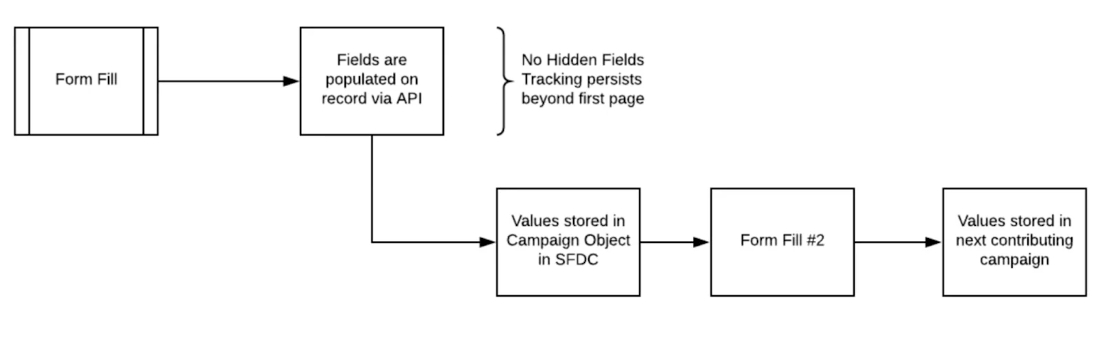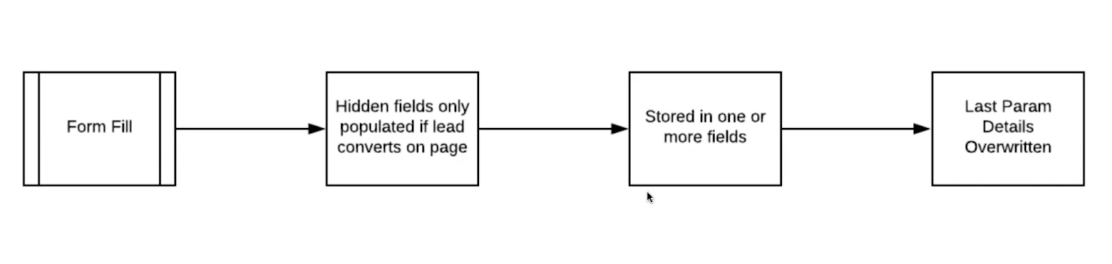 In this approach, you also need a process for consistently updating your forms to add those hidden fields, ensure they’re written properly, and confirm they’re pulling from the parameter correctly. This native process then stores the value in the field you’re leveraging and typically overwrites whatever the last parameter UTM or details were.
