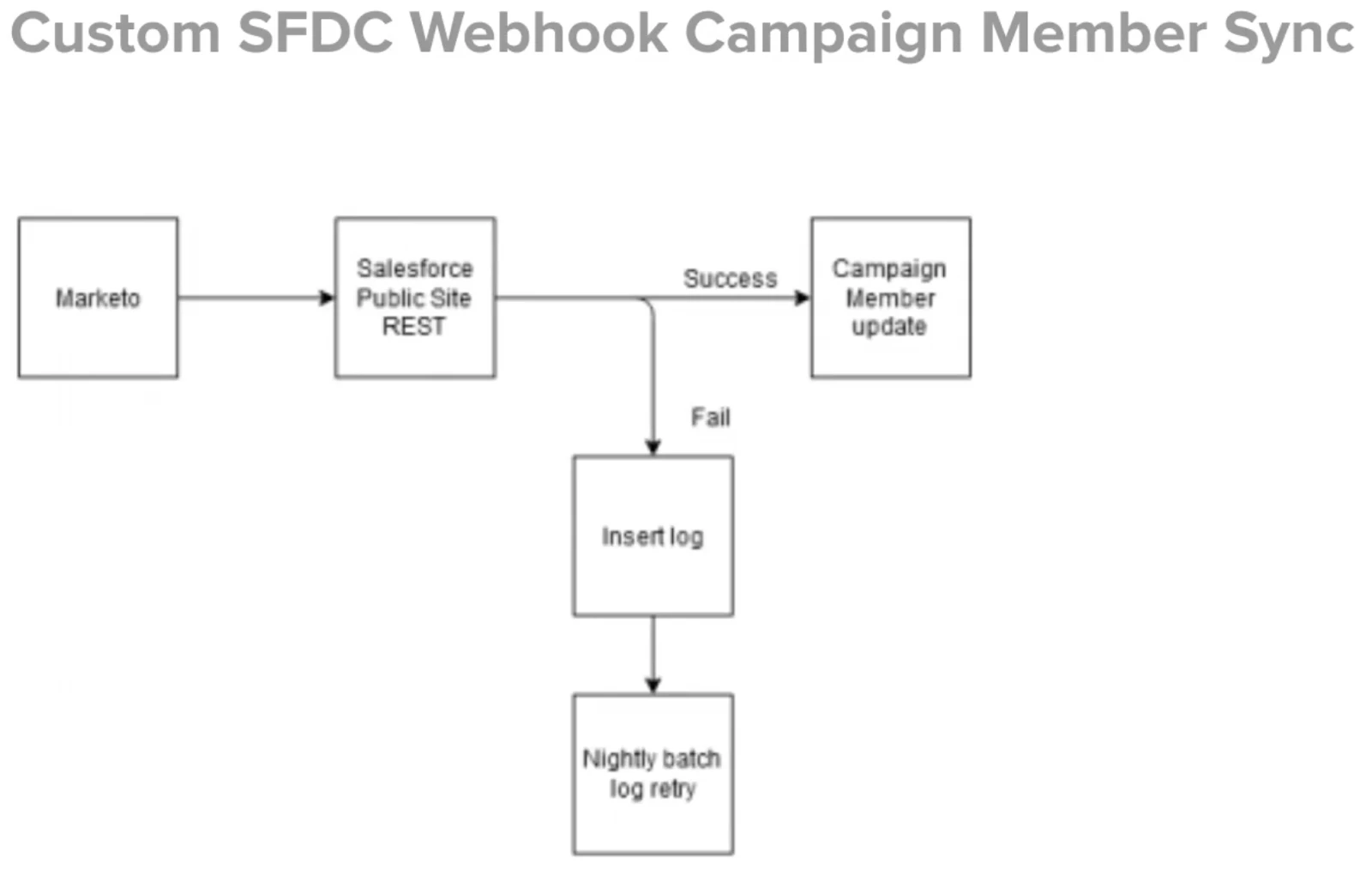 The webhook is built on the Marketo side, and then the SFDC admin would have to surface a public REST API input on the Salesforce side. This public REST site is only going to point to the Campaign Member object—it won’t modify or update data related to the account, contact, lead, or opportunity. As such, the risks are relatively low, but they will still warrant a conversation with your SFDC admin.