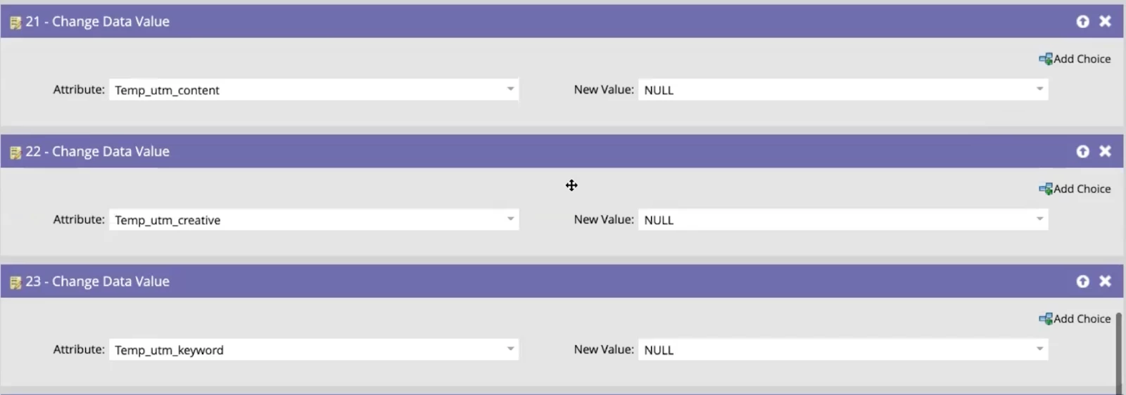 The first set should be “temp” UTM fields. This would include one temporary holding field for each of the parameters you’re capturing, and would be used in your hidden fields or your API script to capture UTMs. These fields are then used to push that data into your more permanent holding data set values, after which they are nulled.