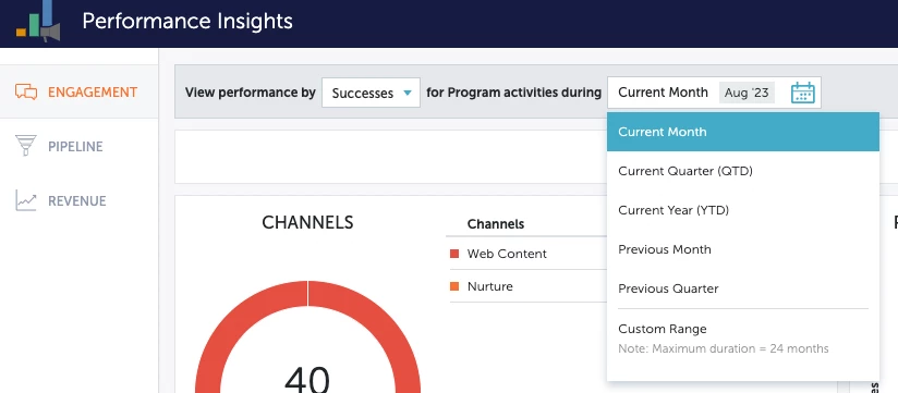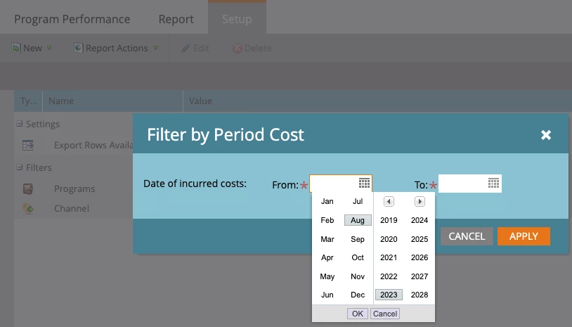 - Time Filter: In addition to providing ROI, period cost also serves as a “timeframe” tag to a program as Period Cost requires you to select the month the program is associated to for reporting purposes, and this is being used as a time filter in program reporting. In a Program Performance report, using Period Cost as a filter allows you to choose programs that incurred cost in select months for reporting. Similarly, in MPI dashboard the marketing activity time period selection is based on the period cost month(s) association by default. See screenshot examples below showing “time filter” (by period cost months) in reporting.