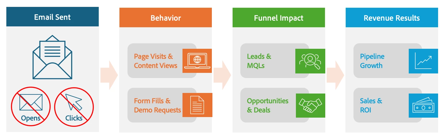 In the meantime, real human behavior is happening outside the email itself: prospects are visiting your website directly and completing a form later, or they are interacting with content across multiple channels. By relying solely on opens and clicks, marketers risk missing the signals that truly drive conversions, pipeline progression, and revenue.