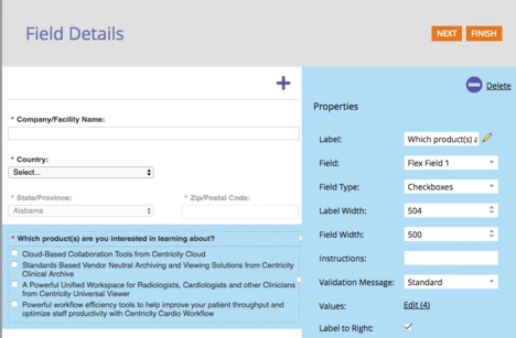When creating a form, add the custom field and then change the label to have the field appear like a custom question. Below is an example of a form used by Healthcare Digital for collecting specific product interest by using a Flex Field and assigning a couple of choices the form respondent can pick from.